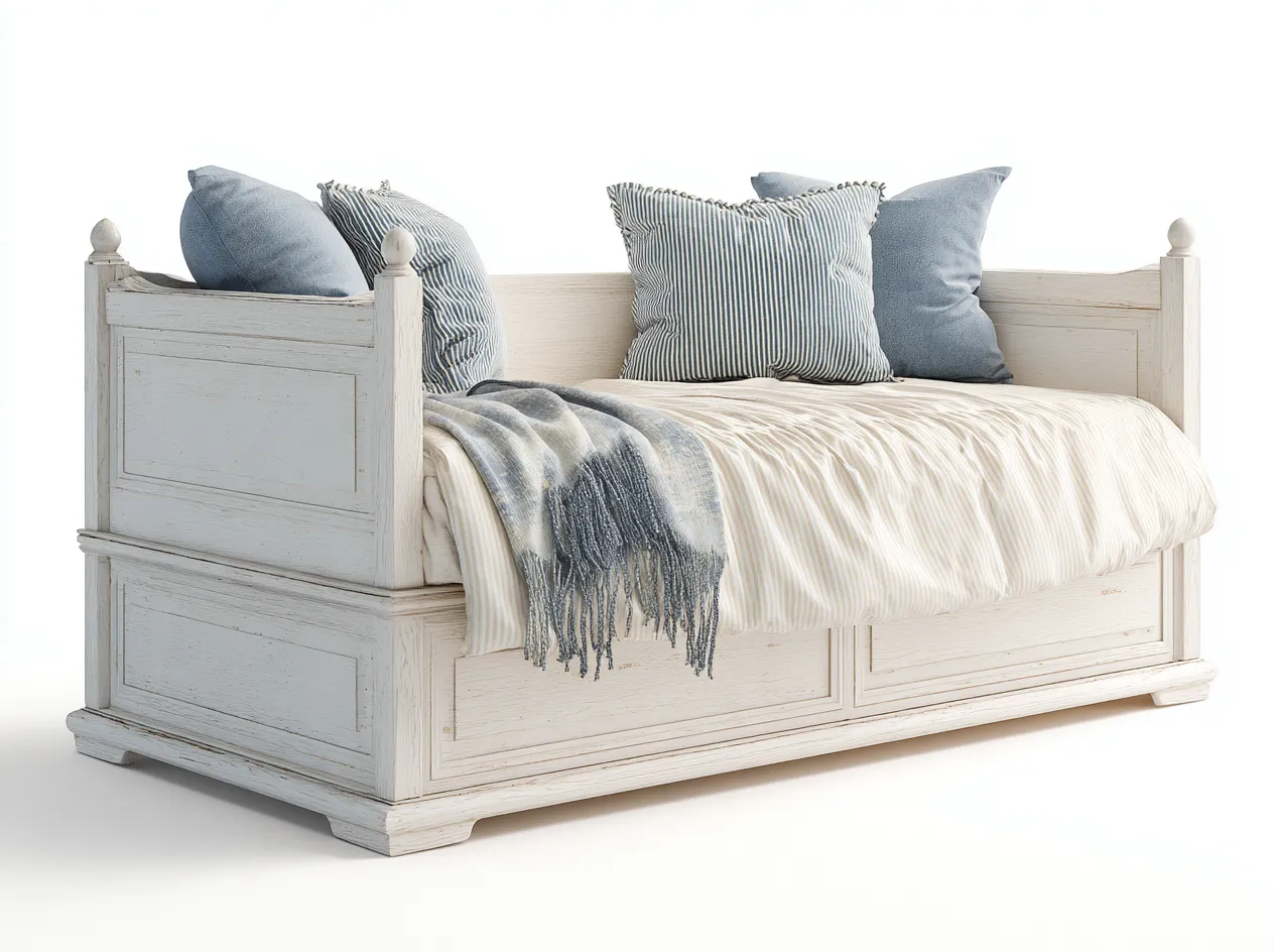 El diseño con respaldo lateral permite utilizar el mueble como sofá durante el día. La superficie amplia facilita su uso como cama cuando se necesita un espacio adicional para descansar. La base robusta proporciona soporte estable durante el uso cotidiano.