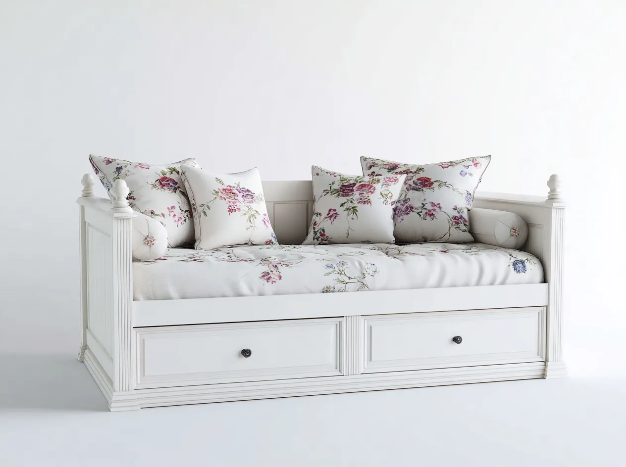 Este sofa cama esta diseñado para ofrecer una solucion funcional y decorativa en dormitorios salas de estar o habitaciones de invitados. Su estructura permite utilizarlo como asiento durante el dia y como superficie de descanso adicional cuando sea necesario. El acabado en color blanco combinado con tapizado de estampado floral crea un ambiente luminoso y elegante que se integra facilmente en interiores de estilo clasico o romantico.