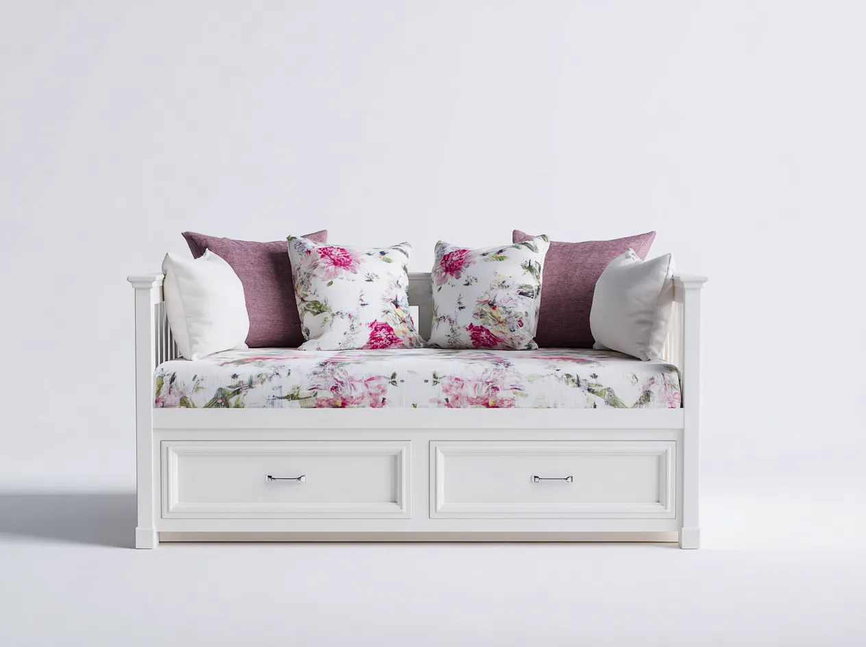 Sofás cama 200x90x85 cm - madera blanca y tapicería floral - 2 cajones - diseño clásico para dormitorio y salón