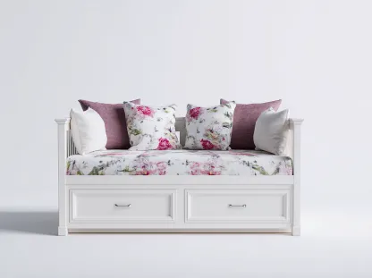 El diseño permite utilizar el mueble como sofá durante el día y como cama auxiliar cuando es necesario. Los reposabrazos laterales proporcionan apoyo cómodo para la espalda y los brazos. Los cajones inferiores ofrecen espacio adicional para guardar textiles u objetos de uso diario.